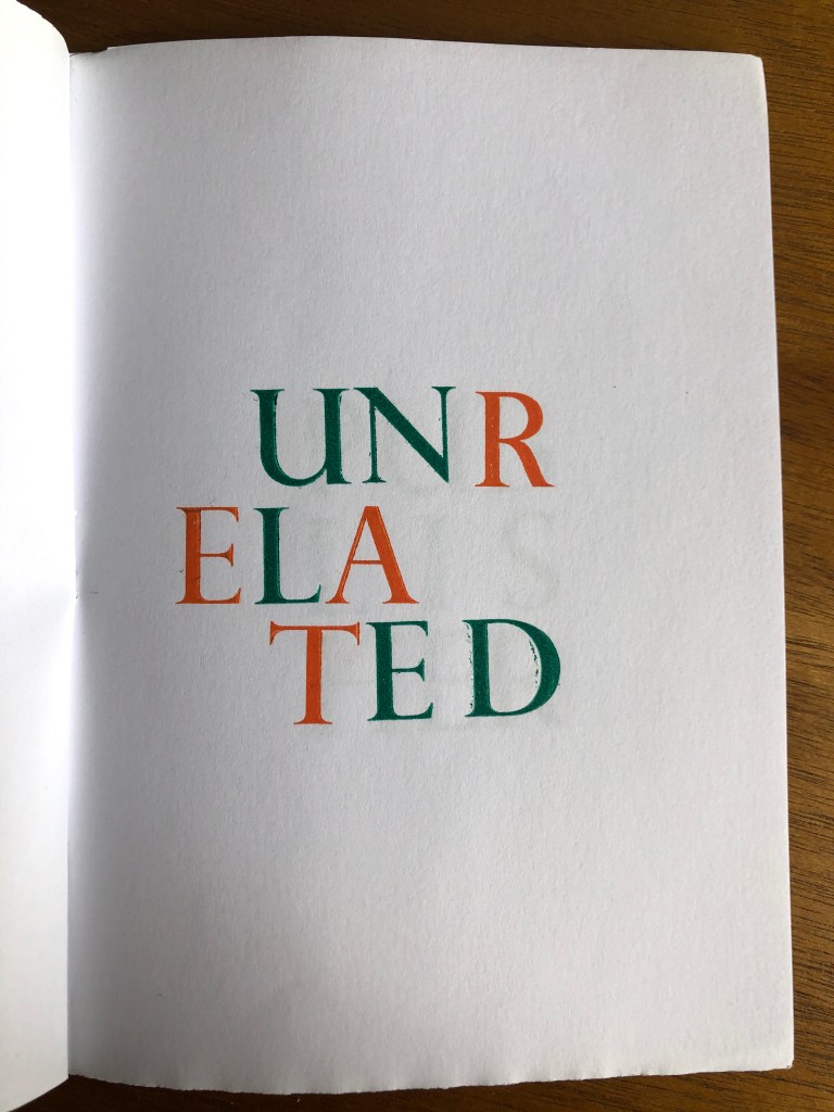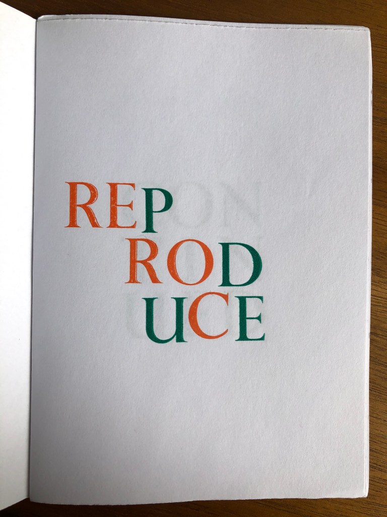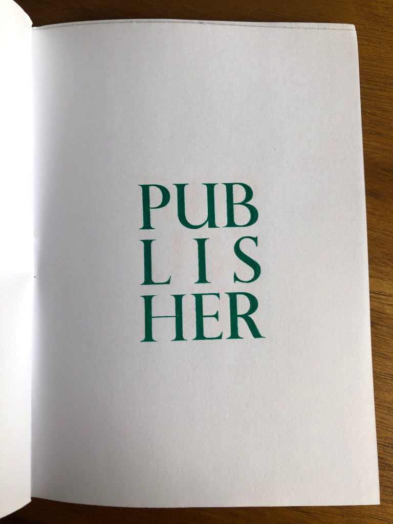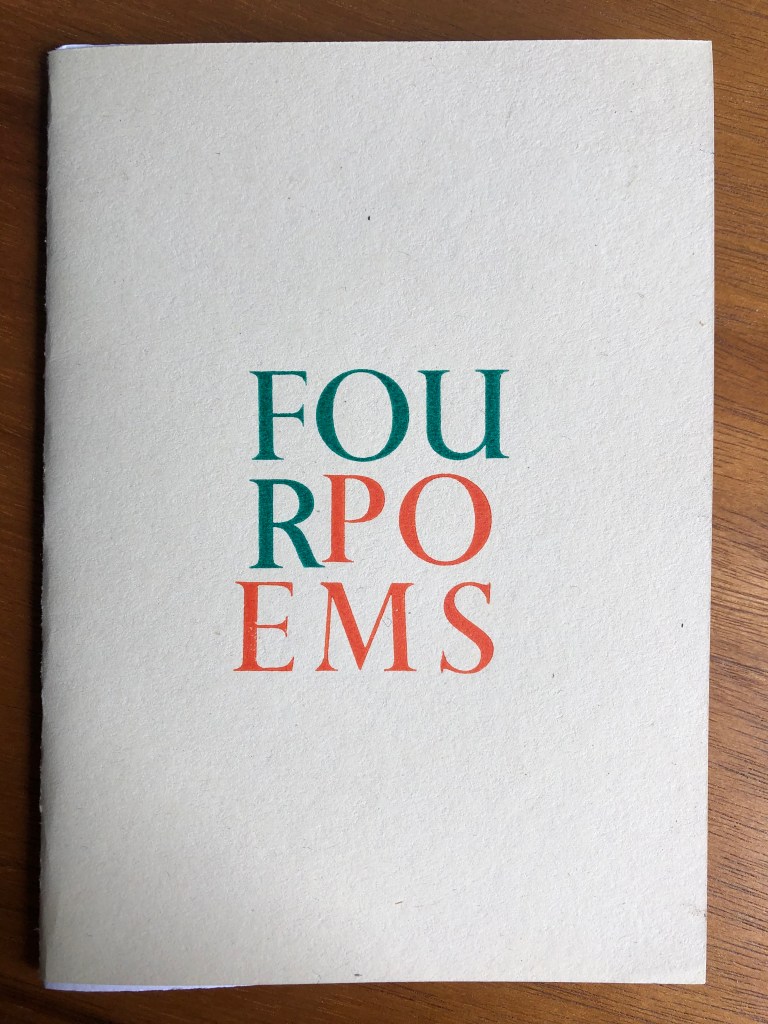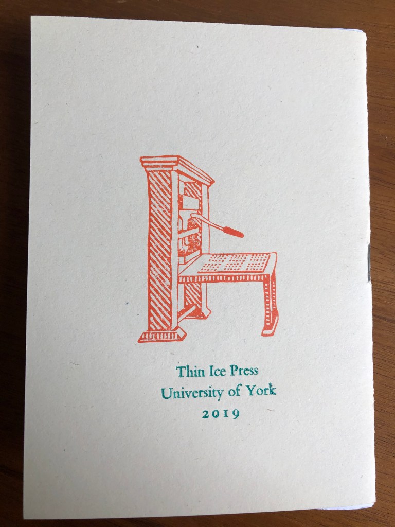 10-page stapled pamphlet, handprinted in two colours on Adana Eight-Five presses. 48pt Perpetua Titling type, on copy paper with card cover. Open edition.