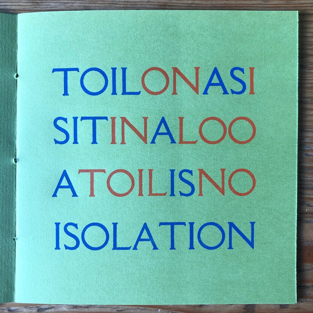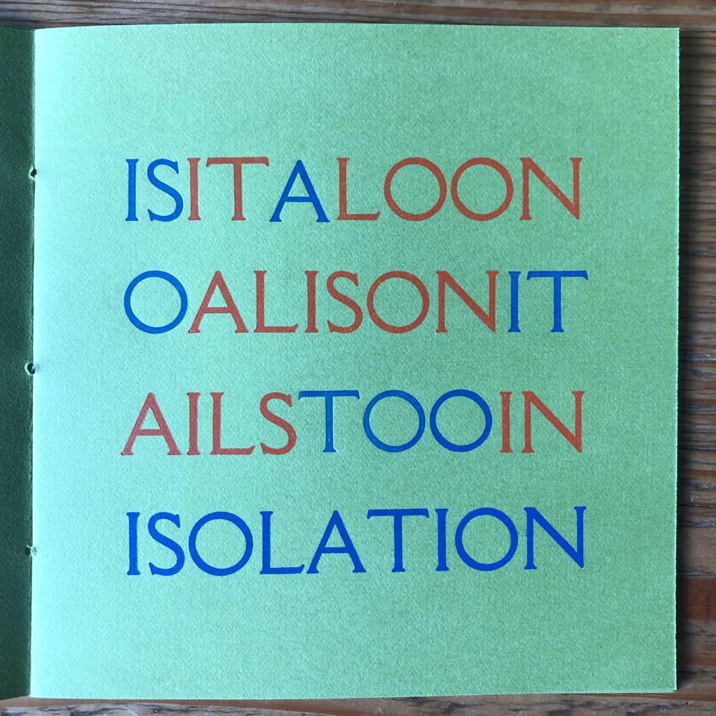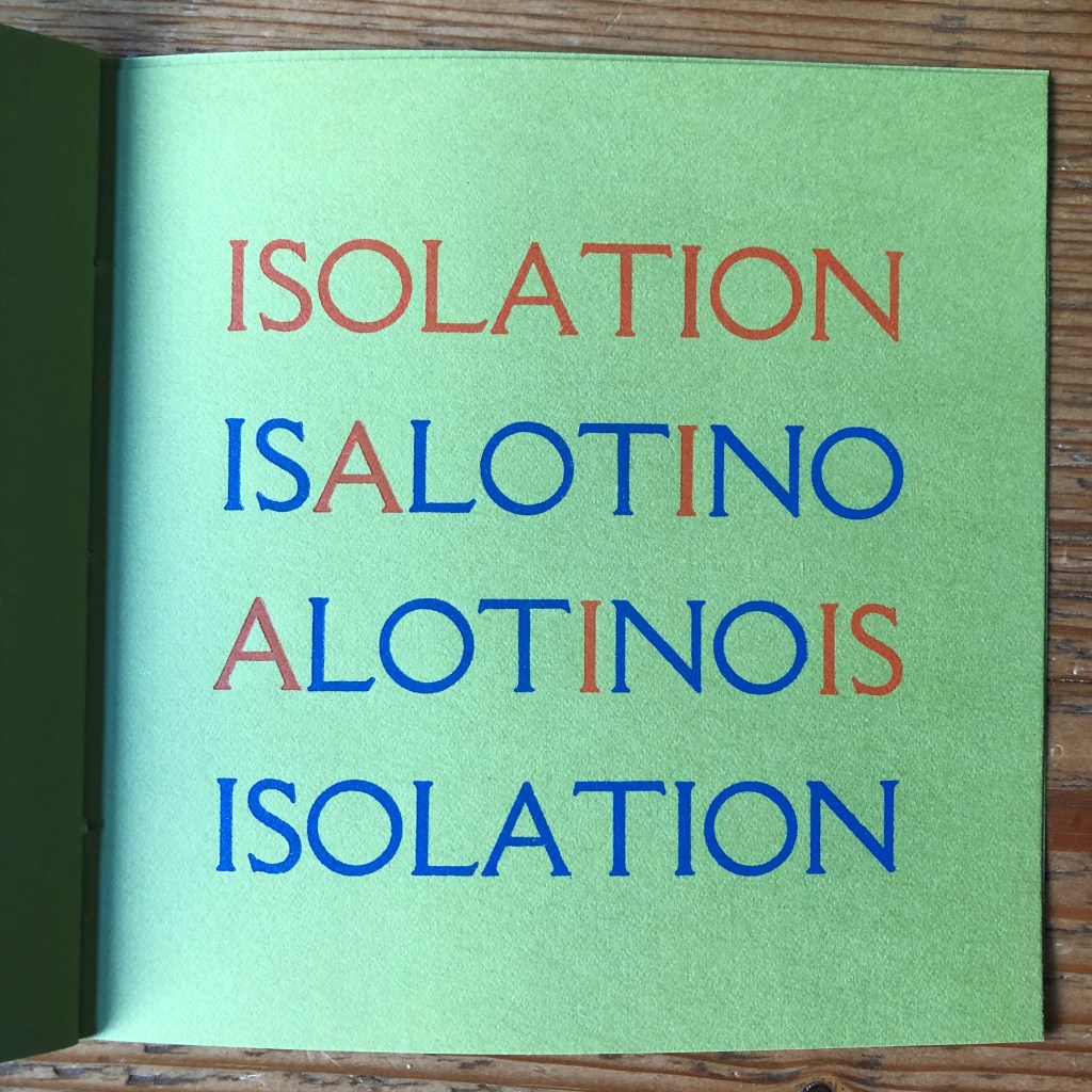 11-page saddle-stitched pamphlet, handprinted on Adana Eight-Five press in March-April 2020. Nine four-line anagram poems printed in two colours with nine pieces of type. 48pt Westminster type, unknown paper stock, 140mm x 140mm. Limited, numbered edition of 40.