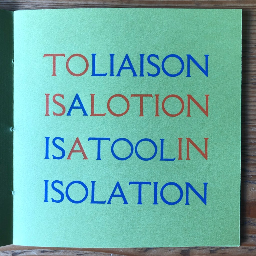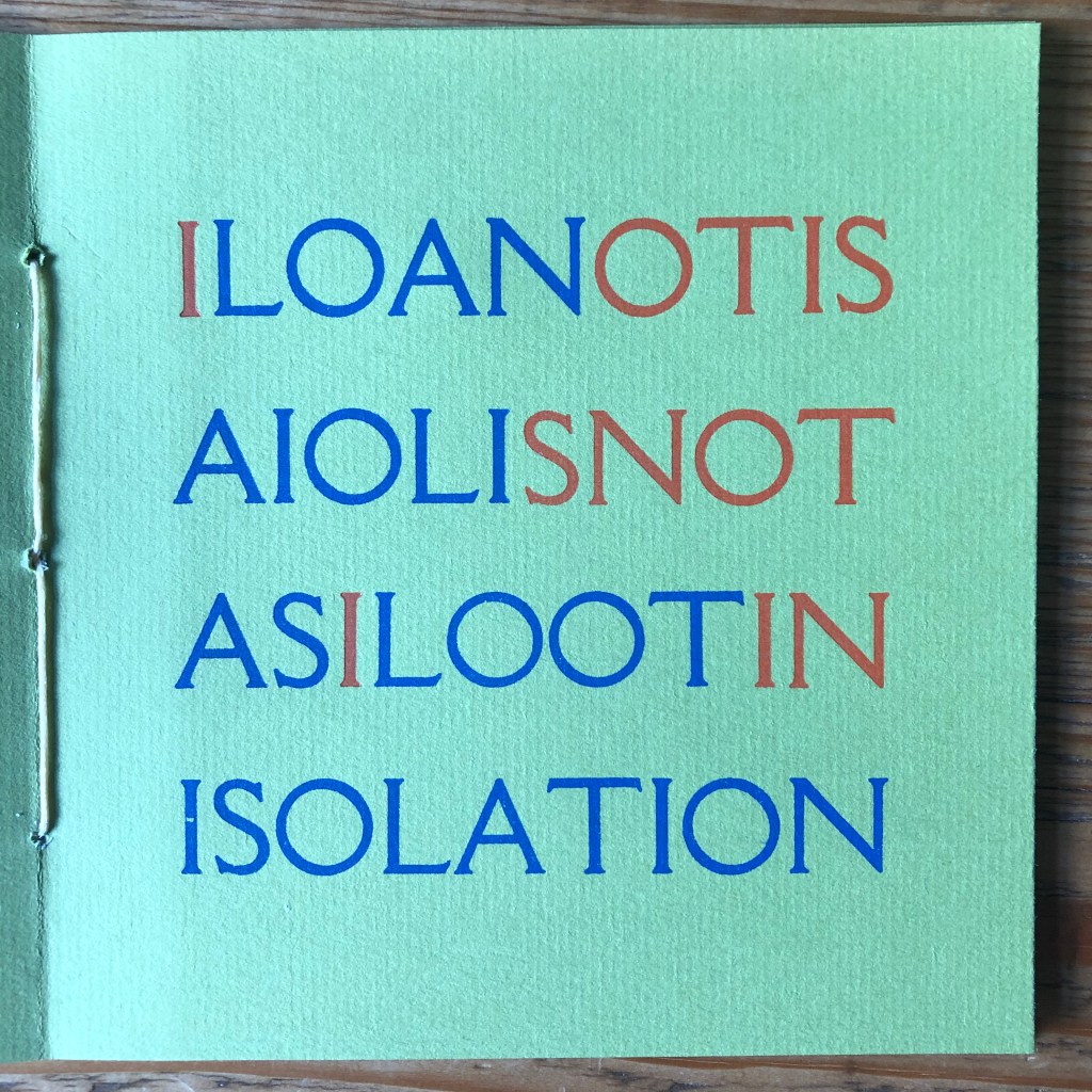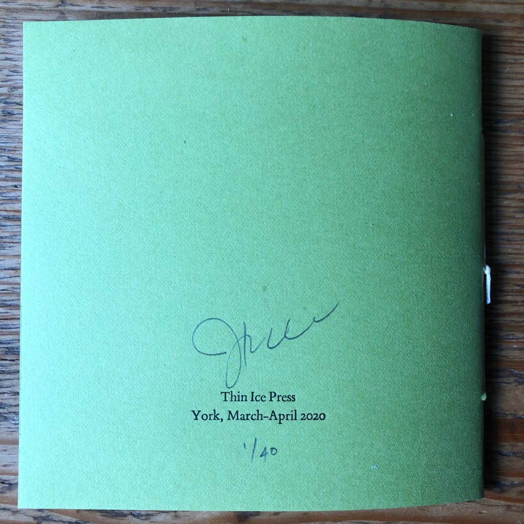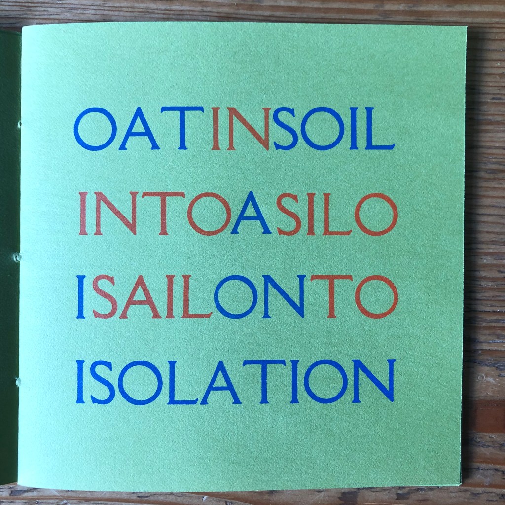 11-page saddle-stitched pamphlet, handprinted on Adana Eight-Five press in March-April 2020. Nine four-line anagram poems printed in two colours with nine pieces of type. 48pt Westminster type, unknown paper stock, 140mm x 140mm. Limited, numbered edition of 40.